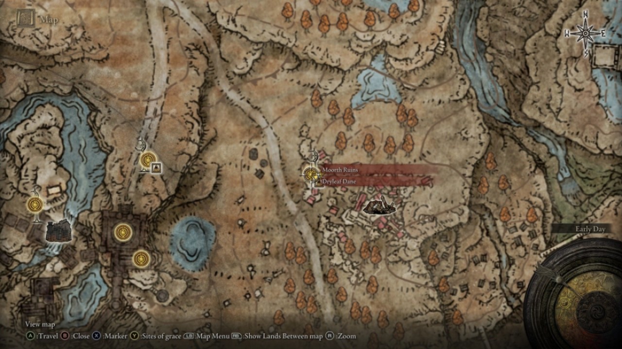The monk in question is Dryleaf Dane, who can be found to the east of the Highroad Cross at Moorth Ruins. He’s waiting at a Miquella Cross at the entrance to the ruins near a Site of Grace, so you can cross one more Cross off your list and pick up a Scadutree Fragment while you’re there.