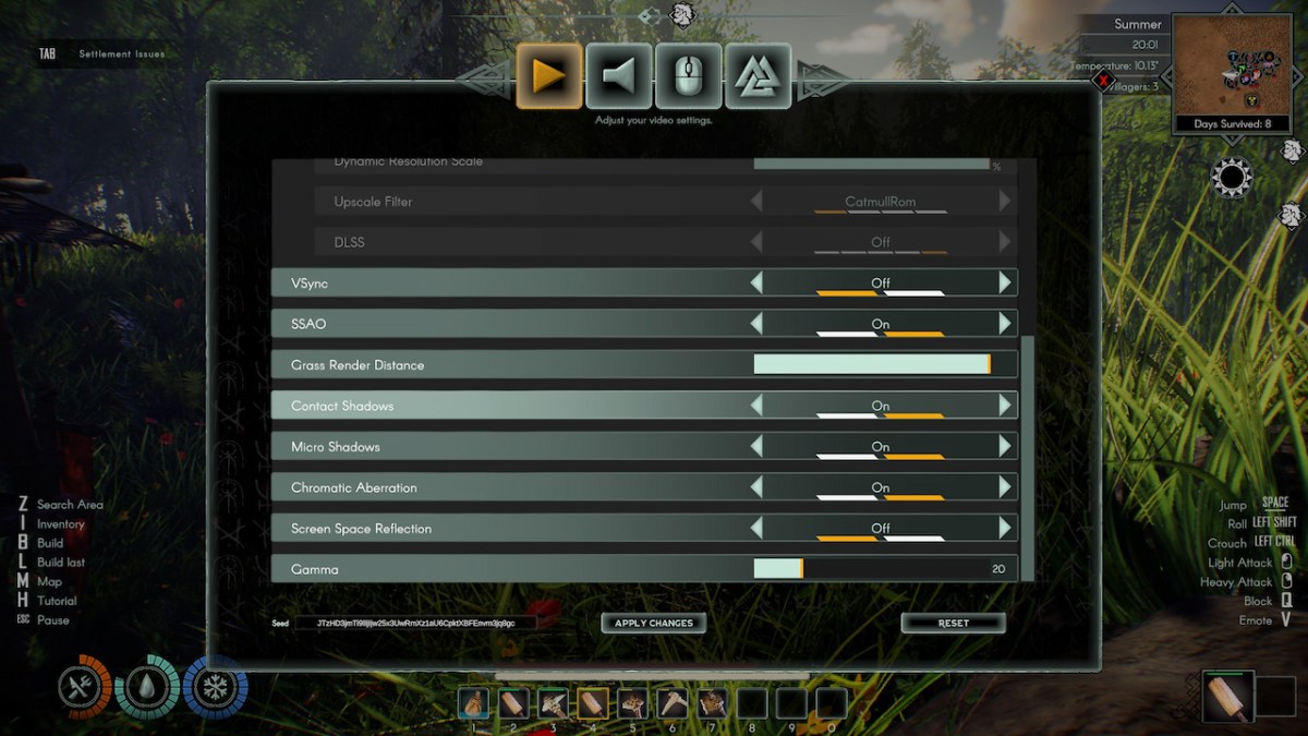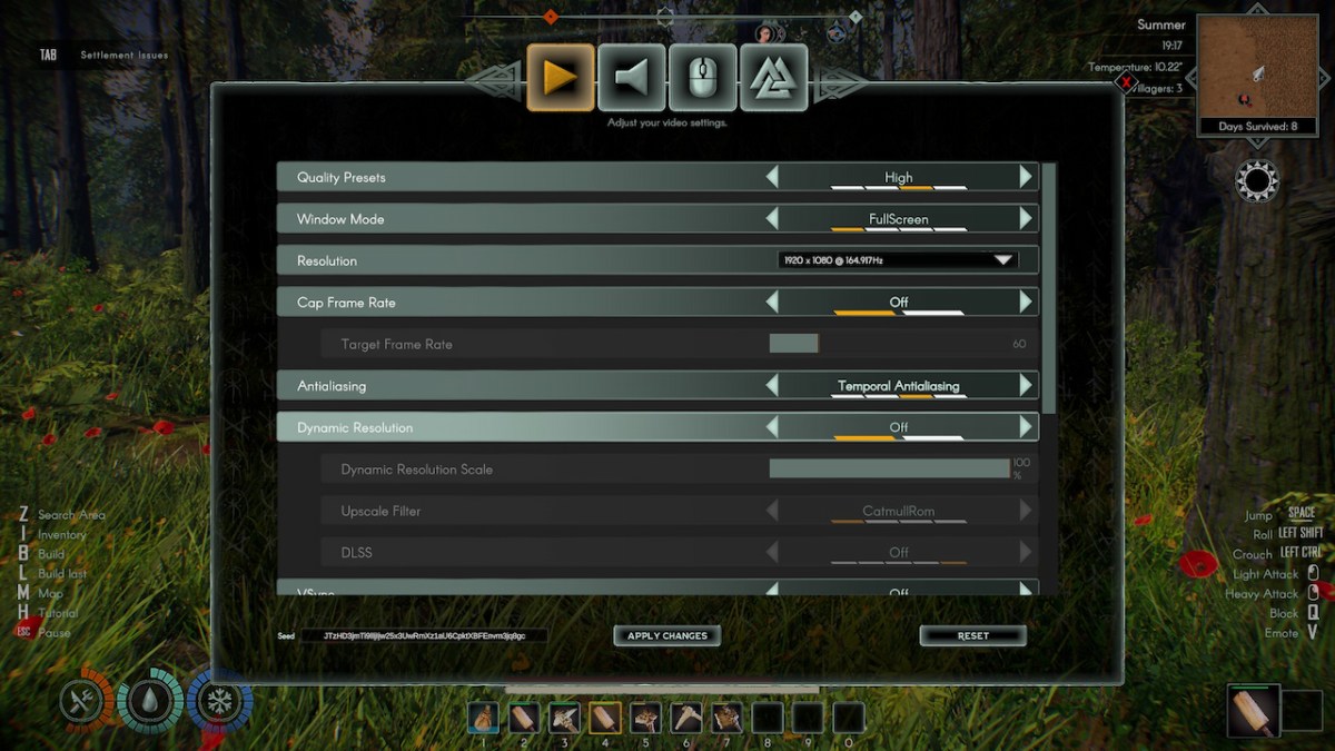 As I started Aska, I tested to see if the best settings in Palworld would work. They kind of do, but Aska has a little more graphical complexity to it. Plus, as you get more villagers and grow your base, the performance may be impacted.Â