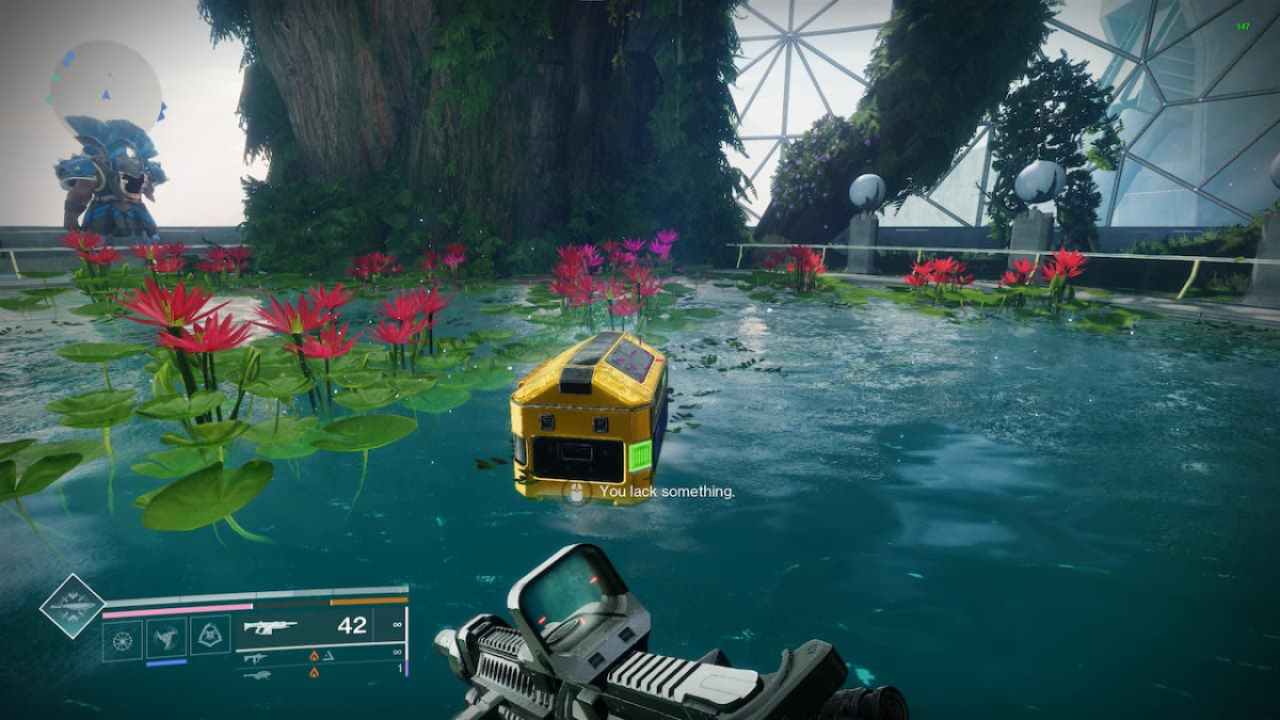 After you’ve placed the Visions on the pedestals, a golden regional chest will spawn in the center. Earning the Exotic version of the Khvostov also earns you the legendary version as well, which we’ll tell you how to do further below. But after you’ve grabbed the purple variant of the gun, the chest will say “You lack something.”