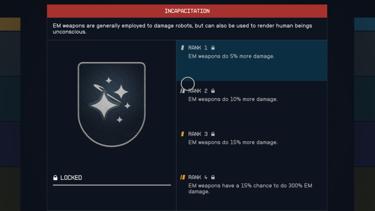 Don’t forget there’s also a dedicated skill tree just for EM weapons called Incapacitation. Like other Combat skill trees, you can increase damage dealt with this weapon type. Rank 1 increases damage by 5%, Rank 2 increases to 10%, Rank 3 increases to 15%, and Rank 4 retains 15% plus a chance to deal an extra 300% EM damage. Once you unlock Rank 4, consider using high-fire rate EM weapons for a higher likelihood of triggering that massive damage buff.