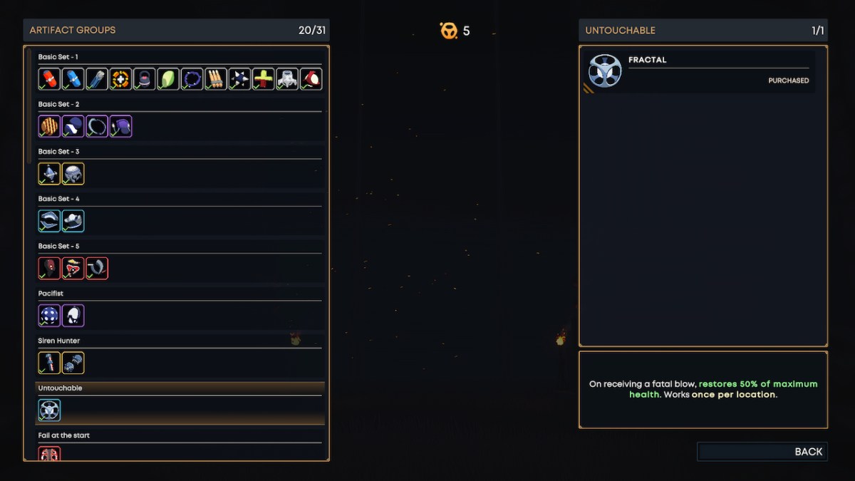 You’ll have the Emporium to peruse for more Artifacts. Interestingly, most of the Artifacts are locked behind achievements. As you complete these achievements, you’ll unlock Artifact groups. Then can you purchase the Artifacts with Omni Stones to add them to your runs.
