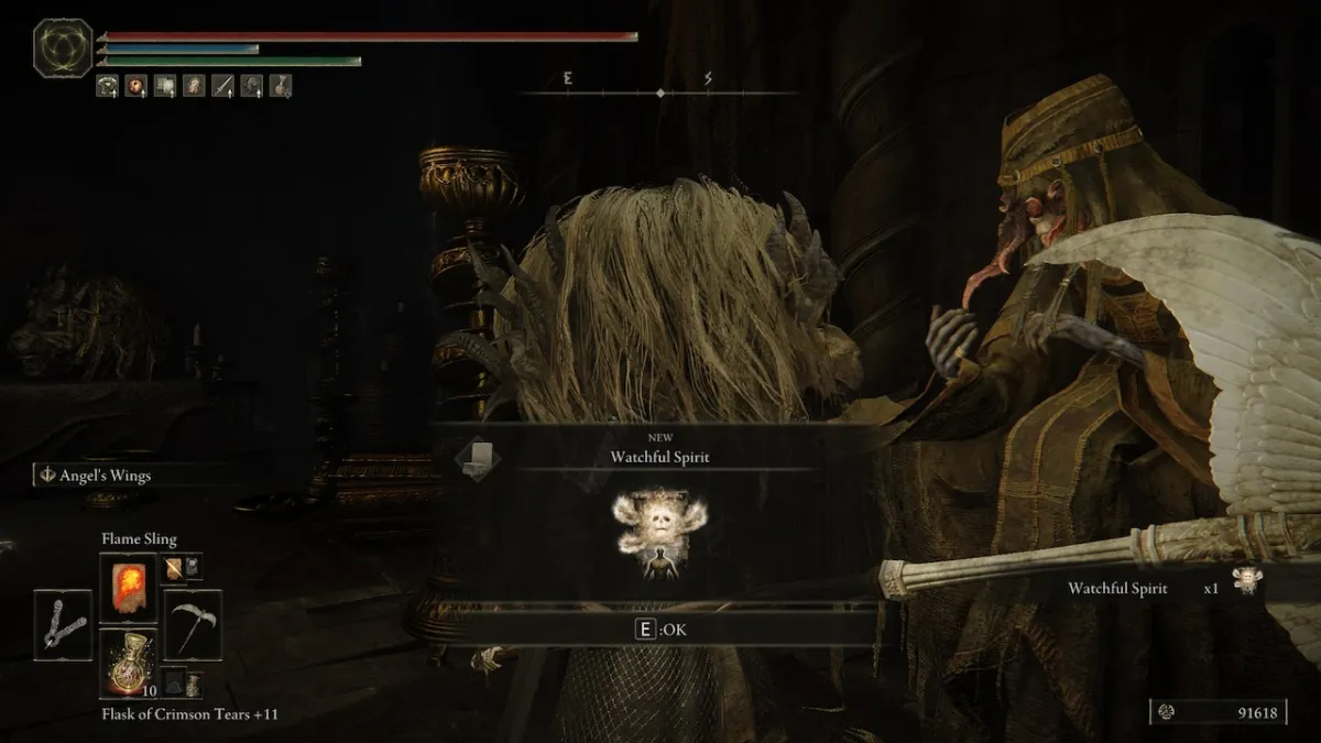 She’ll now be much more inclined to speak to you. After going through a string of dialogue once, you’ll need to speak to her a second time to receive the Watchful Spirit Incantation. This will summon a guardian spirit above the caster’s head, and it requires 26 Faith.