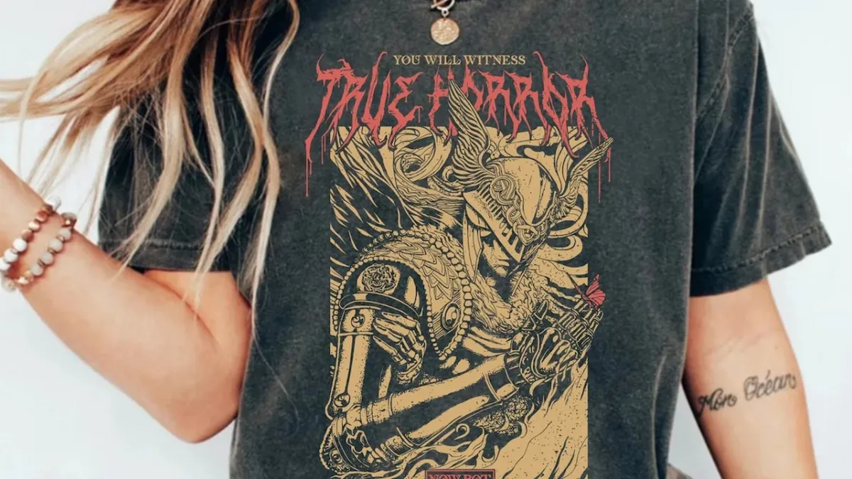 Depicted on the shirt is Malenia in all her glory with the words “You will witness true horror” written up top in a wild typeface. The drawing itself is spectacular, no matter which color you choose.